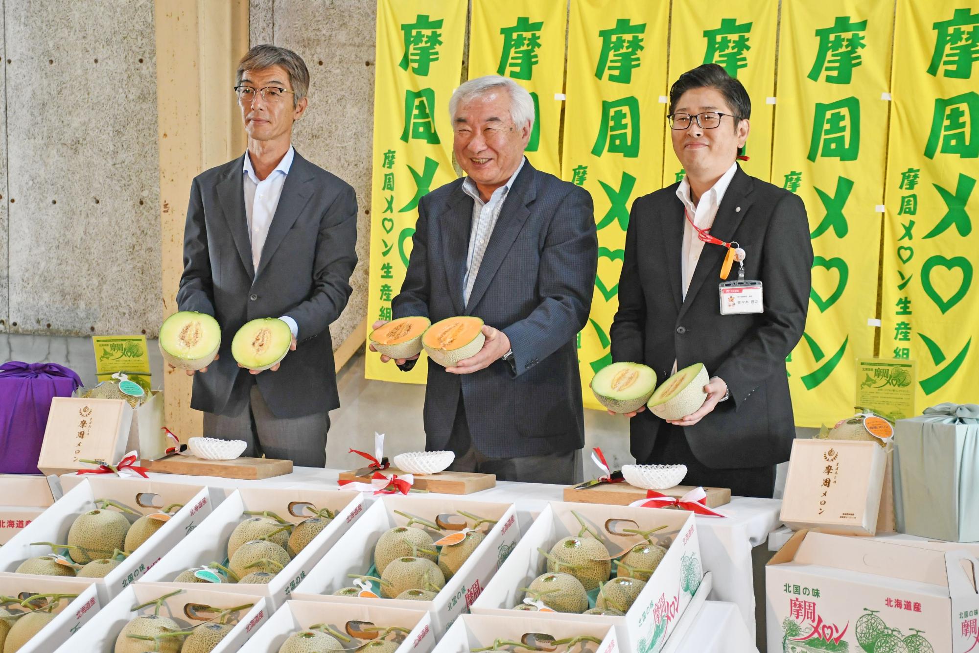 摩周メロン生産組合(窪内英和組合長)の豊穣祭が7月30日、町農産物集出荷センターで開催され、吉備津副町長、摩周湖農協八幡健誠副組合長、弟子屈郵便局佐々木啓之局長がメロンカットを行いました。今年は4,5月の低温とその後の猛暑により温度管理や遮熱対策に苦労したが、すっきりとした甘さでちょうど良い大きさのメロンが収穫できたと報告がありました。