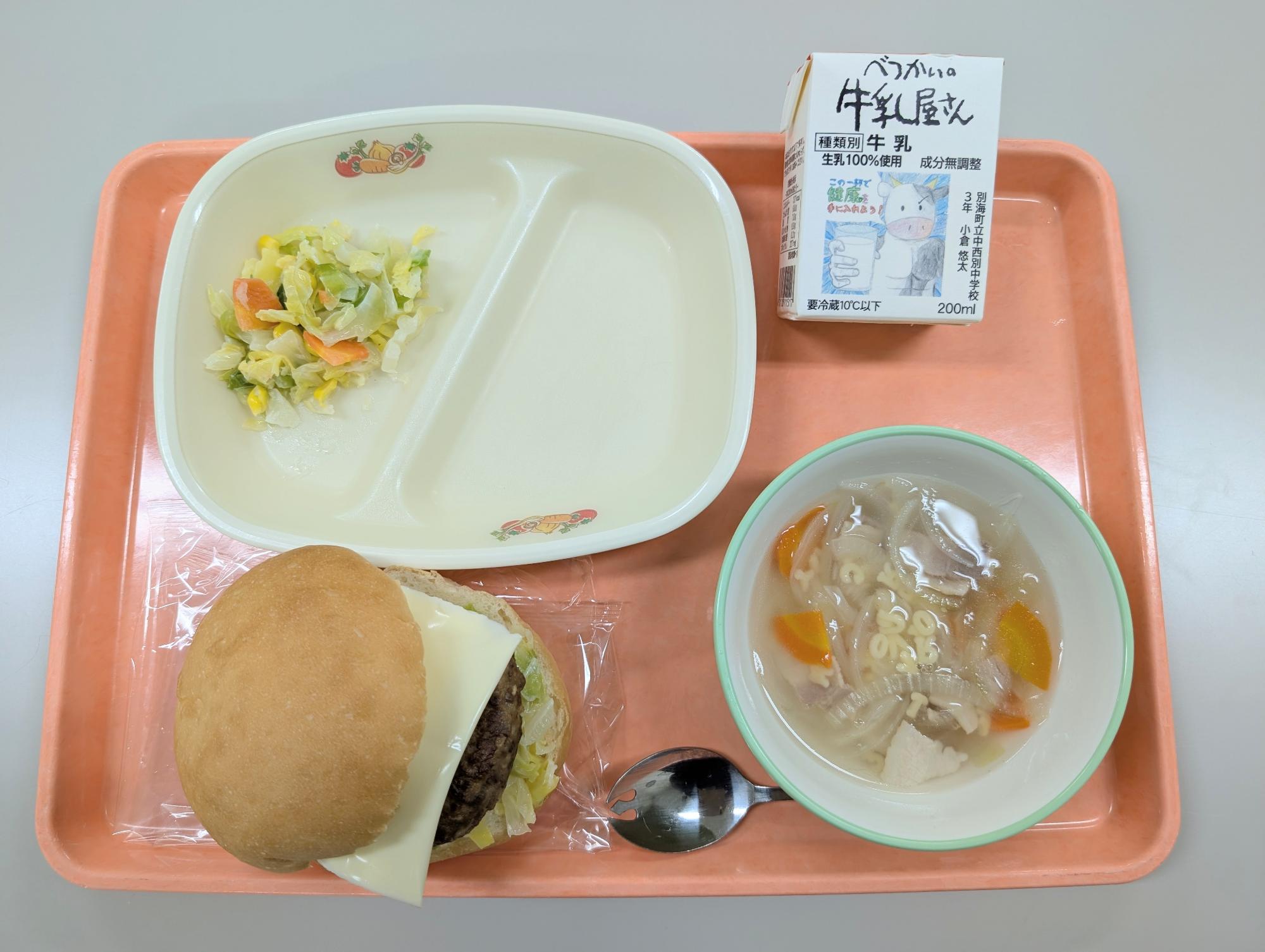 副食 ハンバーグ・スライスチーズ・コールスローサラダ・マカロニスープ