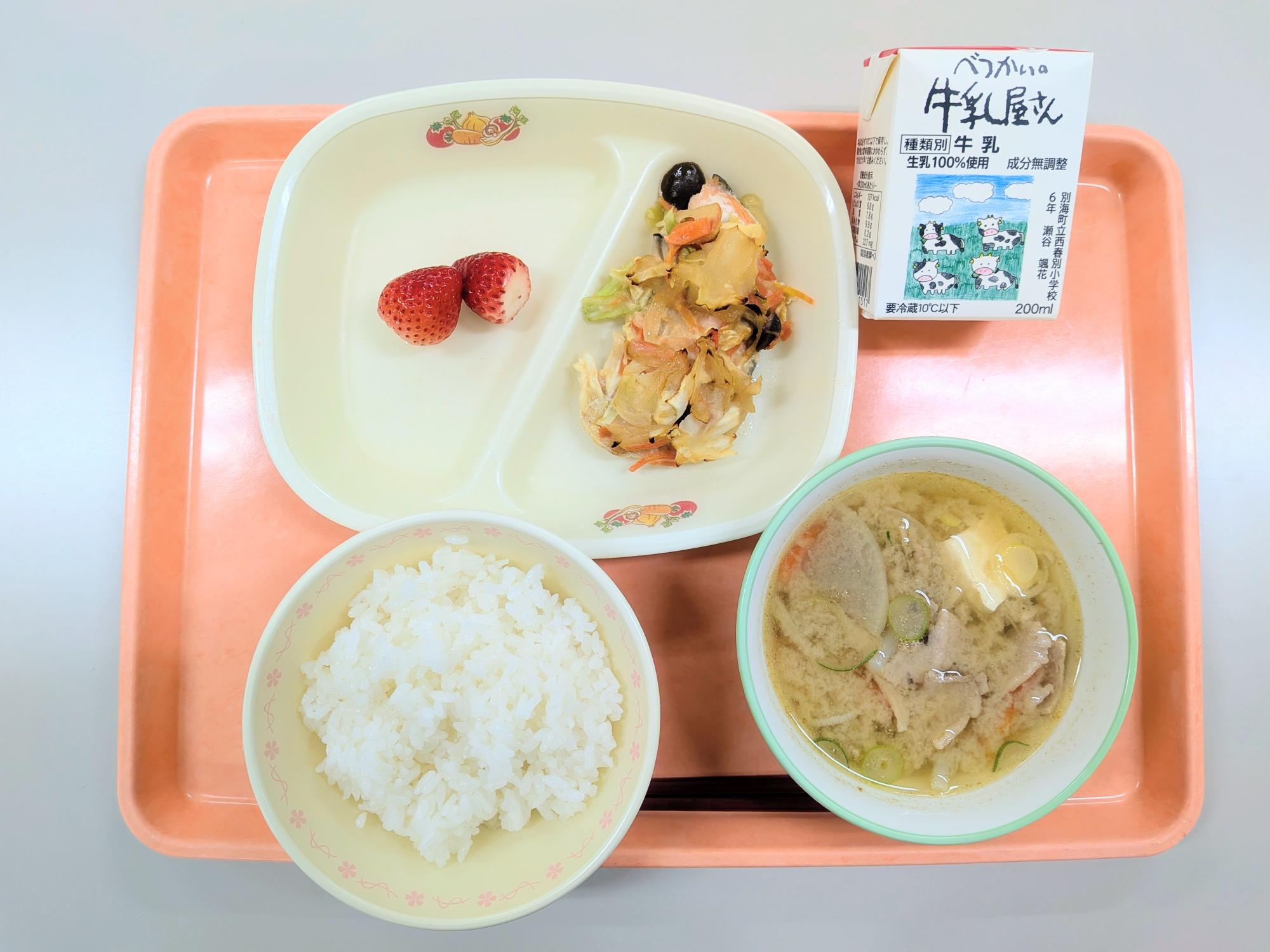 副食 鮭のちゃんちゃん焼き・豚汁・イチゴ(摩周ルビー)