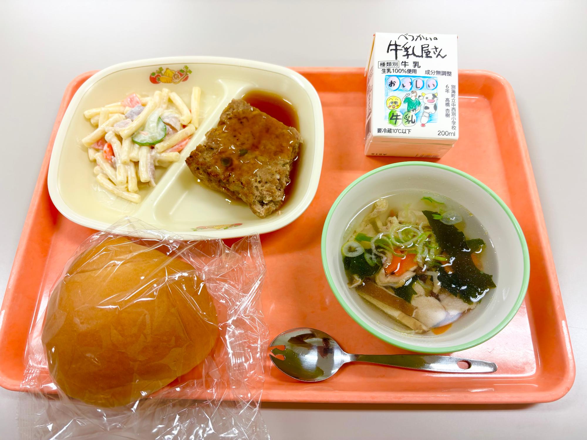 副食 ミートローフ(照り焼きソース)・マカロニサラダ・わかめスープ