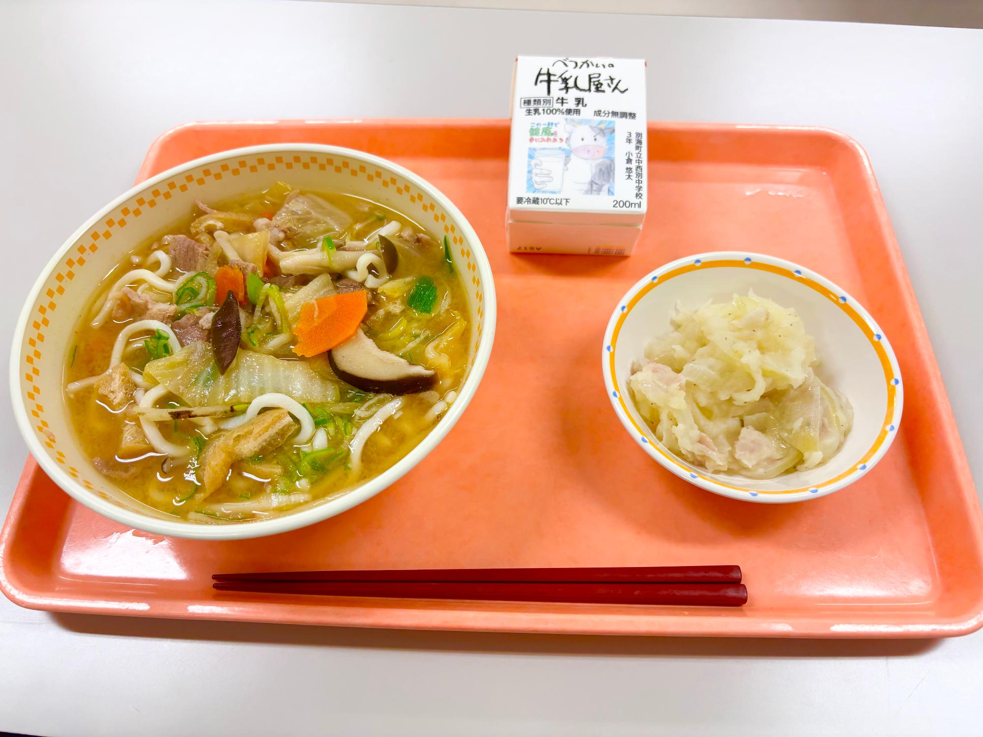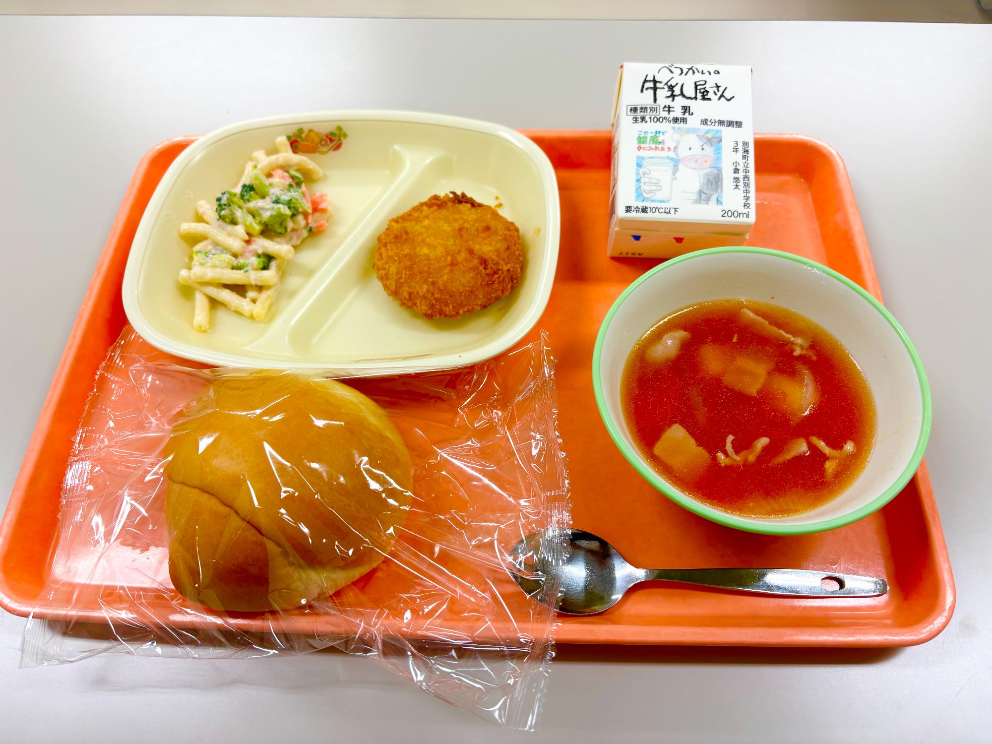 本日の給食のミネストローネは、弟子屈産のじゃが芋と玉ねぎを使用した手作り料理となっております。